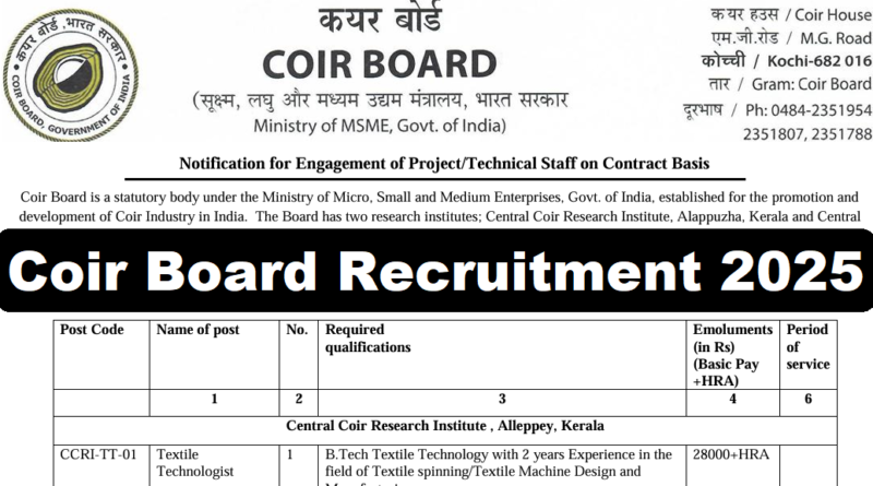Coir Board Recruitment 2025, Technical & Project Staff Latest Vacancy 2025, 20/06/2025 Last Date
