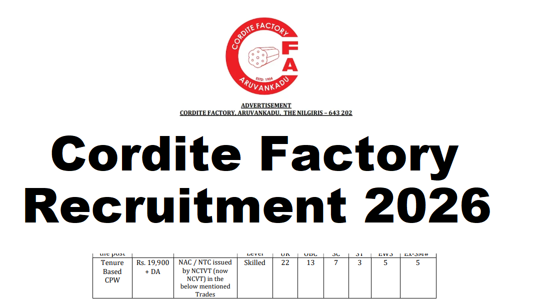 Cordite Factory CPW Recruitment 2026: Applications are invited from the citizens of India fulfilling the requisite qualification/ criteria for engagement as Tenure based CPW Personnel on CONTRACT BASIS, to work at Cordite Factory, Aruvankadu, The Nilgiris, Tamil Nadu, for a period of ONE year from the date of engagement, and extendable to FOUR years, based on factory requirement and individual performance. Cordite Factory Aruvankadu CPW Recruitment Full Notification Out. Cordite Factory CPW Recruitment 2026 Application last date not yet released. Plese Join Our Telegram channel for Application Start and End date update.