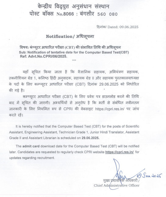 The admit card download link for the Computer Based Test (CBT) will be made available on 25.06.2025. Candidates are advised to regularly visit the CPRI website (https://cpri.res.in/) for updates regarding recruitment.