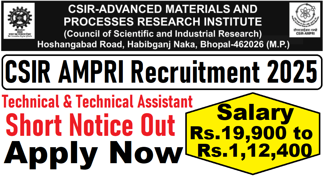 CSIR AMPRI Recruitment 2025 : CSIR- Advanced Materials and Processes Research Institute (AMPRI) की ओर से 13 Posts पर Recruitment निकली है जिसका Online form 10/12/2025 से शुरू है | CSIR AMPRI Recruitment 2025 Online form 04/01/2026 तक भरा जायेगा | Diploma & Graduate Pass in various candidates CSIR AMPRI Recruitment 2025 online form भर सकता है | Interested and eligible candidates CSIR AMPRI Recruitment 2025 form भर सकते हैं |CSIR AMPRI Recruitment Short Notification निचे दिया गया हैI CSIR AMPRI Recruitment Apply Link निचे दिया गया है I
