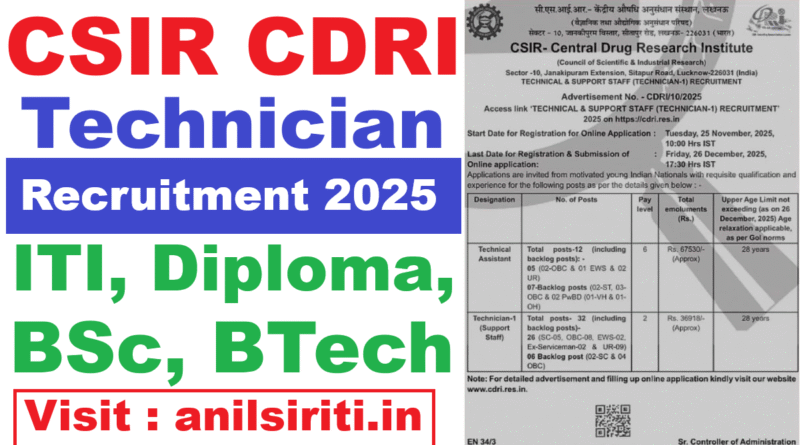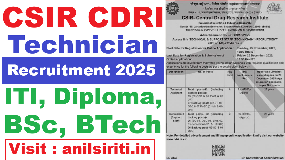 CSIR CDRI Technician Recruitment 2025: Opportunity for technically qualified persons to join as Technical & Support Staff in CSIR – Central Drug Research Institute, Lucknow in the areas of Life Sciences, Chemical Sciences, Pre-clinical Sciences and Scientific & Technical support divisions of CSIR-CDRI. CSIR CDRI Technician Recruitment 2025 Short notification given below. CSIR CDRI Technician Full Notification released on 25-11-2025. CSIR CDRI Technician Recruitment 2025 apply before 26-11-2025. CSIR CDRI Technician Recruitment for ITI and other qualification candidates. CSIR CDRI Recruitment 2025 latest update on Anil Sir ITI Telegram Channel.