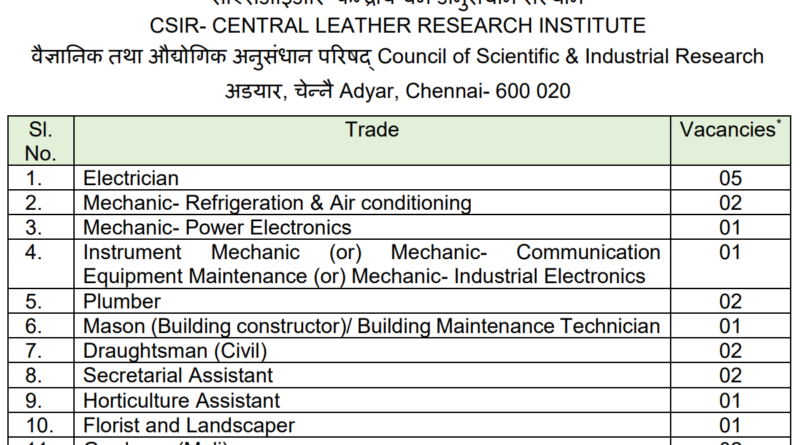 CSIR CLRI Apprentice Recruitment 2024: CSIR CLRI (CSIR- CENTRAL LEATHER RESEARCH INSTITUTE) are invited from eligible and interested candidates for engagement as ITI Trade Apprentices for training in the designated Trades as per the Apprentices Act, 1961 with a fixed monthly stipend of Rs.10,500/- (Rupees ten thousand five hundred only)/ Rs.12,000/- (Rupees twelve thousand only) for one/ two years duration tenable at CLRI as per the qualification, age etc., as detailed below. CSIR CLRI Apprentice Walk in Interview on 27-09-2024 at CLRI Chennai.