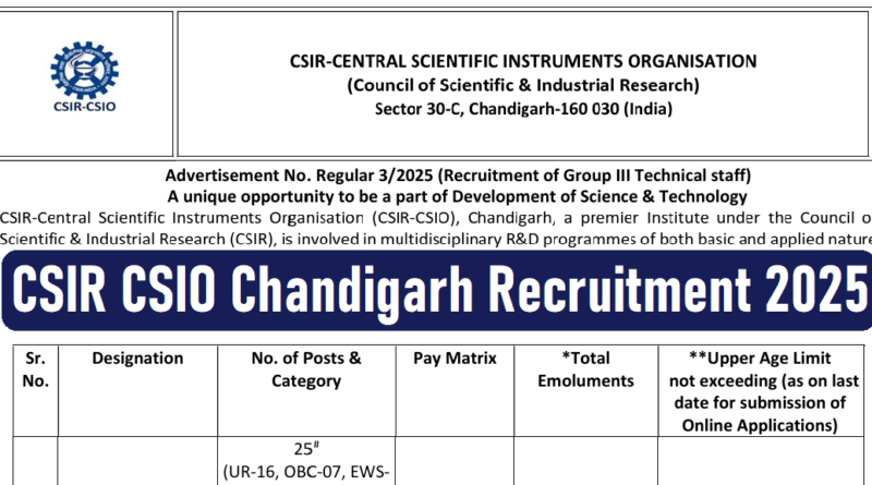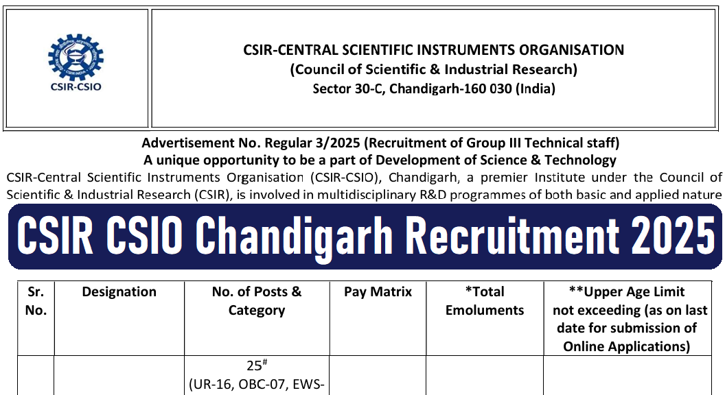 CSIR CSIO Chandigarh Recruitment 2025 : CSIR-Central Scientific Instruments Organization (CSIR-CSIR) की ओर से 25 Posts पर Recruitment निकली है जिसका Online form 16/07/2025 से शुरू है | CSIR CSIO Chandigarh Recruitment 2025 Online form 15/08/2025 तक भरा जायेगा | Diploma & Degree Pass in various candidates CSIR CSIO Chandigarh Recruitment 2025 online form भर सकता है | Interested and eligible candidates CSIR CSIO Chandigarh Recruitment 2025 form भर सकते हैं | CSIR CSIO Chandigarh Recruitment Full Notification निचे दिया गया हैI CSIR CSIO Chandigarh Recruitment Apply Link निचे दिया गया है I
