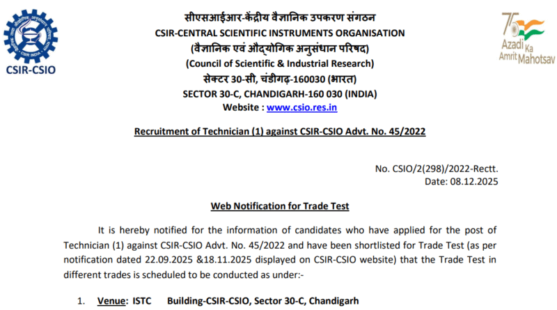 CSIR CSIO Technician Recruitment 2025 Trade Test Notification Out: It is hereby notified for the information of candidates who have applied for the post of Technician (1) against CSIR-CSIO Advt. No. 45/2022 and have been shortlisted for Trade Test (as per notification dated 22.09.2025 &18.11.2025 displayed on CSIR-CSIO website) that the Trade Test in different trades is scheduled to be conducted as under