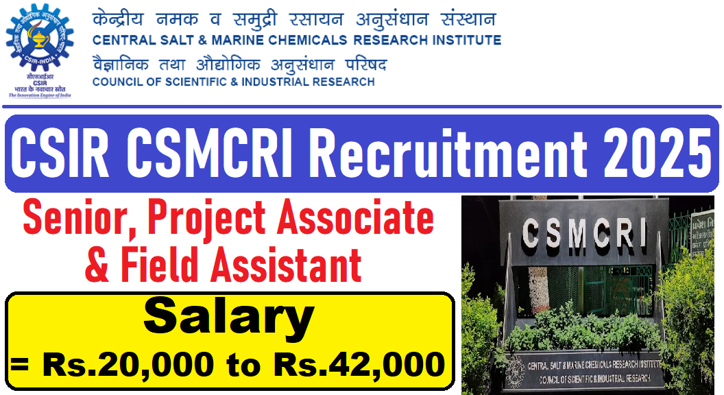 CSIR CSMCRI Recruitment Salary 2025 Post Name Salary Project Associate – I (PAT-I) Rs.31,000 +HRA Project Associate – I (PA-I) Rs.18,000 +HRA Project Associate – I (PAT-I) Rs.31,000 +HRA Project Associate – I (PAT-I) Rs.31,000 +HRA Senior Project Associate – I (Senior PAT-I) Rs.42,000 +HRA Field Assistant Rs.20,000 +HRA
