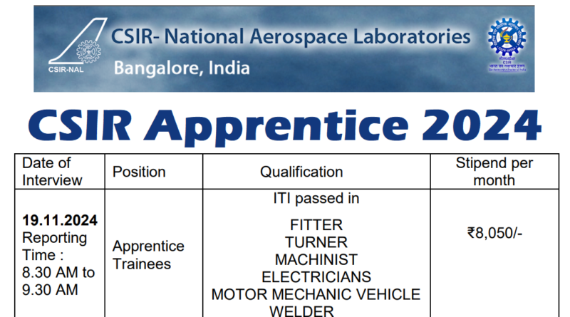 CSIR NAL Apprentice Recruitment 2024: CSIR-NAL is a unit under the Council of Scientific and Industrial Research (CSIR), an autonomous body under the Ministry of Science and Technology, Govt. of India. As per Regional Directorate of Skill Development and Entrepreneurship (RDSDE), CSIR-NAL inviting ITI passed candidates for One Year Apprentice Trainee for Walk-in-Interview.CSIR Apprentice 2024 ITI Pass Fitter, Turner, Mahinist, Electricians, MMV, Welder trades are eligible. CSIR NAL Apprentice 2024 walk in interview on 19-11-2024.
