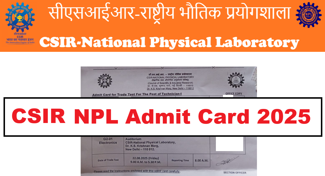 CSIR NPL Recruitment 2025 Trade Test @nplindia.in : CSIR NPL invite application for the post of Technician. CSIR NPL Technician online form last date 08-08-2022. CSIR NPL Skill Test schedule from 21st August 2025 to 08th September 2025. CSIL NPL Trade Test Merit list 2025 given below. CSIR NPL Admit Card sent through India Post. For CSIR NPL Admit Card 2025 check your Post office.