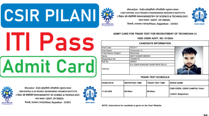CSIR Pilani Recruitment 2025 Admit Card out: CSIR CEERI Pilani की ओर से ITI Pass candidates के लिए Technician की recruitment निकली थी जिसका Online form 23.02.2024 भरना शुरू हुआ था | CSIR CEERI Technician Permanent Recruitment 2024 online form 28-03-2024 तक भरे गये थे | CSIR Pilani Recruitment Exam 2024 11.02.2025 से 14.02.2025 के बीच रहने वाला है | CSIR PILANI Recruitment 2025 Exam के लिए Admit Card जारी कर दिया गया है | CSIR Pilani Admit Card link निचे दिया गया है |