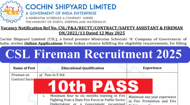 CSL Fireman Recruitment 2025, 10th Pass Latest Vacancy 2025, 23/05/2025 Last Date