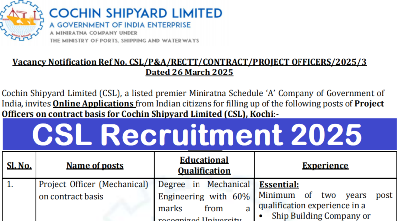 CSL Recruitment 2025 : The Cochin Shipyard Limited (CSL) की ओर से 23 Posts पर Recruitment निकली है जिसका Online form 26/03/2025 से शुरू है |CSL Recruitment 2025 Online form 09/04/2025 तक भरा जायेगा |Bachelor Degree in mechanical Engineering Pass in various candidates CSL Recruitment online form भर सकता है | Interested and eligible candidates CSL Recruitment form भर सकते हैं |CSL Recruitment Full Notification निचे दिया गया हैI CSL Recruitment 2025 Apply Link निचे दिया गया है I