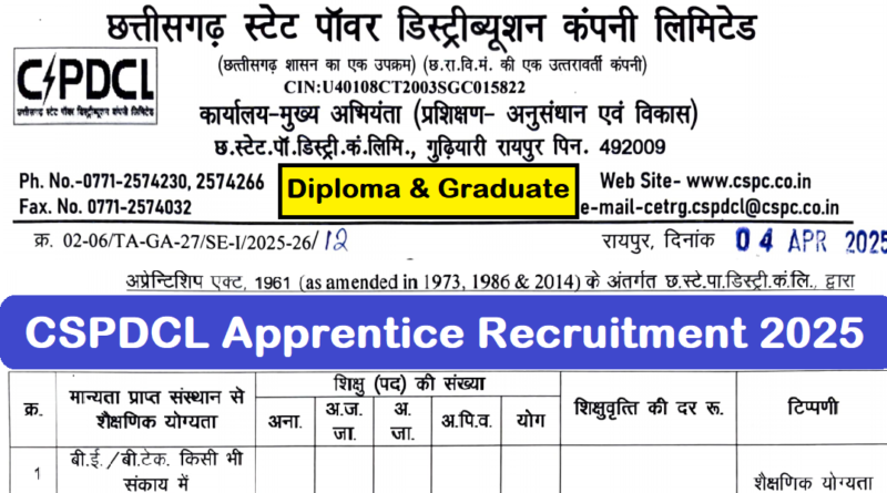 CSPDCL Apprentice Recruitment 2025 : Chhattisgarh State Power distribution Company Limited (CSPDCL) की ओर से 160 Posts पर Recruitment निकली है जिसका Speed Post Application form 04/04/2025 से शुरू है | CSPDCL Apprentice Recruitment 2025 Speed Post Application form 05/05/2025 तक भरा जायेगा | Diploma & Graduate Pass in various candidates CSPDCL Apprentice Recruitment 2025 Speed Post Application form भर सकता है | Interested and eligible candidates CSPDCL Apprentice Recruitment form भर सकते हैं |CSPDCL Apprentice Recruitment Full Notification निचे दिया गया हैI CSPDCL Apprentice Recruitment 2025 Apply Link निचे दिया गया है I