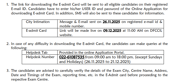 Event Details City Intimation Message & E-mail sent on 26.11.2025 on registered e-mail ID & mobile number. E-Admit Card Link will be made live on 09.12.2025 at 11:00 AM on the DFCCIL website. -