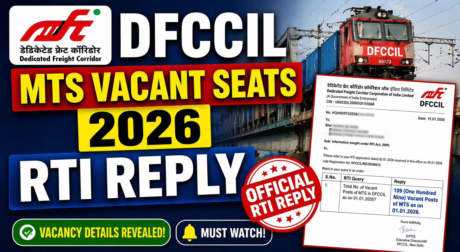 DFCCIL MTS Vacant Seats 2026 RTI Reply: Dedicated Freight Corridor Corporation of India Limited की ओर से ITI Pass candidates के लिए MTS की अभी कितनी Vacant Posts है और Next Vacancy कब तक आयेगी इसकी जानकारी इस Posts पर दी गयी है | DFCCIL ने RTI Reply में बताया की अभी कितनी Vacant Posts हैं |
