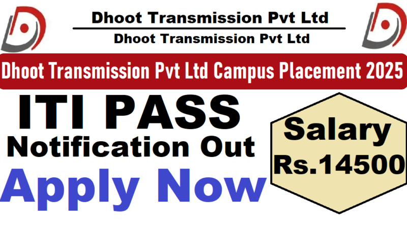 Dhoot Transmission Pvt Ltd Campus Placement 2025 : Dhoot Transmission Pvt Ltd की ओर से Electrician, Fitter, Electronic Mechanic Posts पर Campus Placement निकली है जिसका Interview Date 25 June 2025 , सुबह 09:30 बजे है|ITI Pass in various candidates Offline Campus Placement में शामिल हो सकते हैI आपकी Campus Placement Location – J.S Pvt ITI Palahipatti, Varanasi रहने वाला हैI Dhoot Transmission Pvt Ltd Campus Placement 2025 Full Notification निचे दिया गया है |