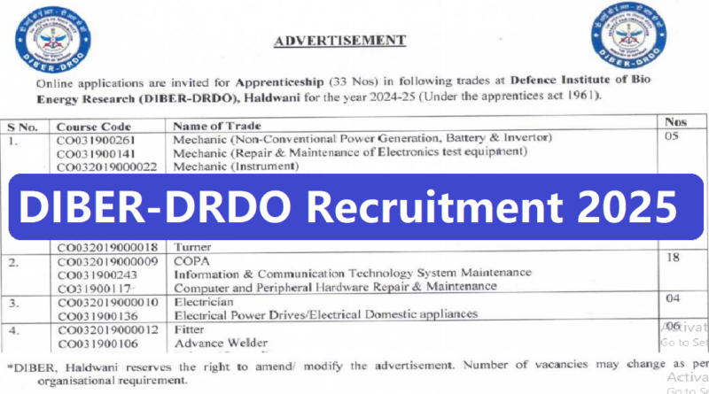 DIBER-DRDO Recruitment 2025 : Defense Institute of Bio Energy Research (DIBER-DRDO) की ओर से 33 Posts पर Recruitment निकली है जिसका Online form शुरू है | DIBER-DRDO Recruitment 2025 Online form 25 January 2025 तक भरा जायेगा |ITI Pass in various trade candidates DIBER-DRDO Recruitment online form भर सकता है | Interested and eligible candidates DIBER-DRDO Recruitment form भर सकते हैं |DIBER-DRDO Recruitment Full Notification निचे दिया गया हैI DIBER-DRDO Recruitment 2025 Apply Link निचे दिया गया है I