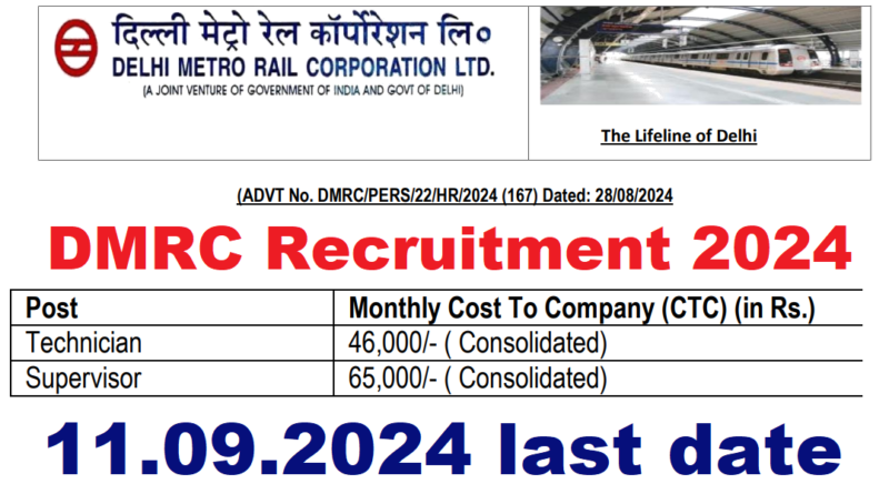 DMRC Recruitment 2024: Delhi Metro Rail Corporation Ltd. invites applications for the posts of Technician, Supervisor. DMRC Recruitment 2024 for ITI, Diploma exprienced candidates. DMRC Recruitment 2024 offline form apply before 11-09-2024. DMRC Recruitment 2024 is Fixed Term Contractual Engagement basis.