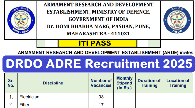 DRDO ADRE Apprentice 2025 : DRDO – Armament Research and Development Establishment (ADRE)की ओर से 70 Posts पर Apprentice Recruitment निकली है जिसका Online form 04/04/2025 से शुरू है | DRDO ADRE Apprentice Recruitment 2025 Online form 20/04/2025 तक भरा जायेगा | ITI Pass in various candidates DRDO ADRE Apprentice Recruitment 2025 online form भर सकता है | Interested and eligible candidates DRDO ADRE Apprentice Recruitment form भर सकते हैं |DRDO ADRE Apprentice Recruitment Full Notification निचे दिया गया हैI DRDO ADRE Apprentice Recruitment 2025 Apply Link निचे दिया गया है I