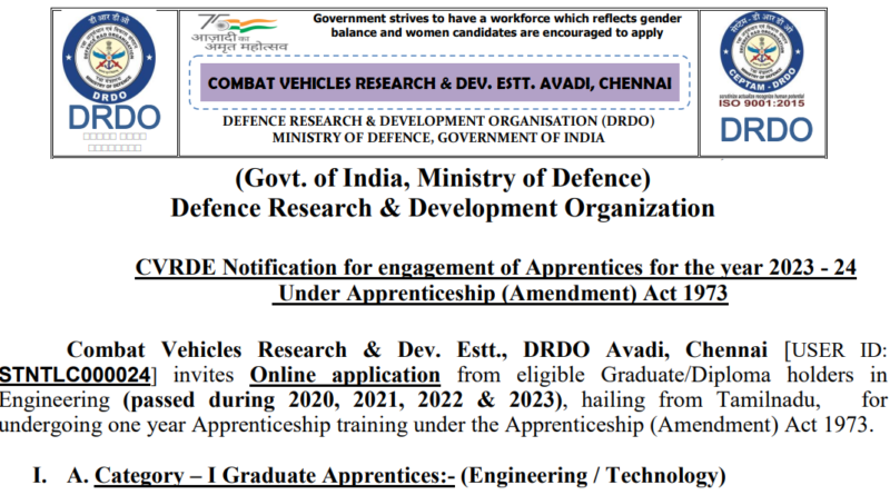 DRDO Apprentice Recruitment 2024: Combat Vehicles Research & Dev. Estt., DRDO Avadi, Chennai [USER ID: STNTLC000024] invites Online application from eligible Graduate/Diploma holders in Engineering (passed during 2020, 2021, 2022 & 2023), hailing from Tamilnadu, for undergoing one year Apprenticeship training under the Apprenticeship (Amendment) Act 1973. DRDO Apprentice for Diploma, BE, B.Tech, B.Com, BSc. Candidates. DRDO CVRDE Apprentice form apply on https://nats.education.gov.in Portal. DRDO CVRDE Apprentice apply before 20.02.2024.