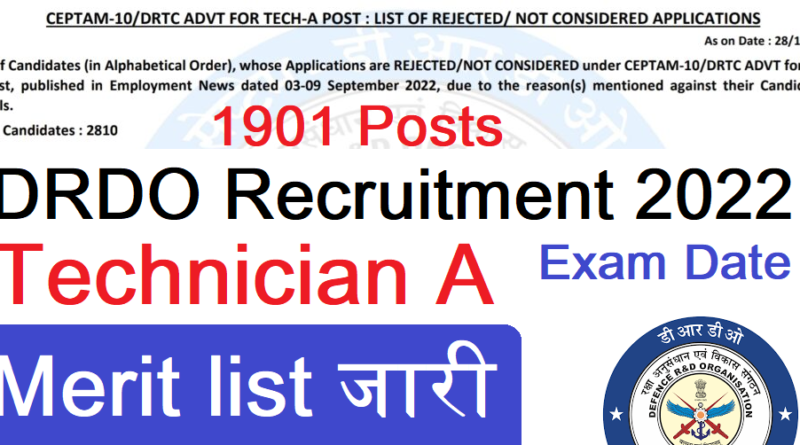 DRDO CEPTAM 10 TECHNICIAN A ITI Pass Reject merit list जारी : DRDO की तरफ से ITI Pass candidates के लिए CEPTAM 10 में Technician A की recruitment निकली थीं। DRDO द्वारा total 1901 post पर भर्ती निकली थी जिसमे ITI के लिए 826 Posts था । DRDO CEPTAM 10 Technician A Post पर ITI के हजारों छात्रों ने online form भरा था जिसमे कुछ candidates ने form गलत और तो कोई दोबारा फॉर्म भर दिया जिसे reject कर दिया गया । DRDO ने CEPTAM 10 के TECHNICIAN A Post के लिए Reject form का merit list जारी कर दिया जिसमे DRDO का Technician a के गलत आवेदन को reject करके merit list जारी किया गया है । अगर अपने DRDO CEPTAM 10 के Technician A form भरा है तो Reject merit list जरूर check करें ।