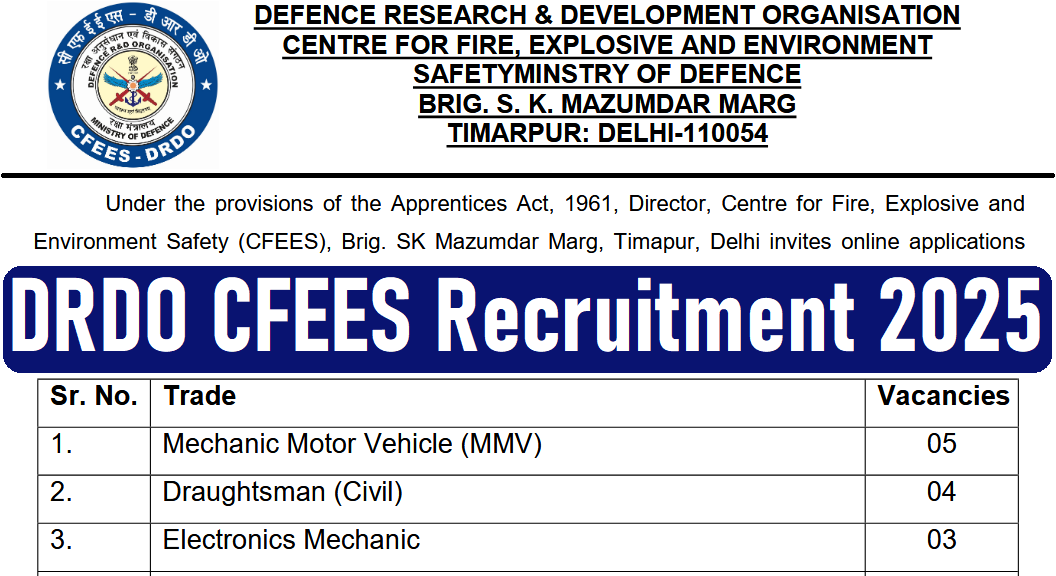 DRDO CFEES Apprentice Recruitment 2025 : DRDO – Centre for Fire, Explosive and Environment Safety (CFEES) की ओर से 38 Posts पर Recruitment निकली है जिसका Online form 19/11/2025 से शुरू है | DRDO CFEES Recruitment 2025 Online form 10/12/2025 तक भरा जायेगा | ITI Pass in various candidates DRDO CFEES Recruitment 2025 online form भर सकता है | Interested and eligible candidates DRDO CFEES Recruitment 2025 form भर सकते हैं | DRDO CFEES Recruitment Full Notification निचे दिया गया हैI DRDO CFEES Recruitment Apply Link निचे दिया गया है I