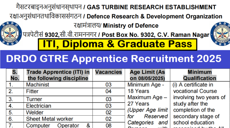 DRDO GTRE Apprentice Recruitment 2025 : The Gas Turbine Research Establishment (DRDO GTRE) की ओर से 150 Posts पर Apprentice Recruitment निकली है जिसका Speed Post Application form 09/04/2025 से शुरू है | DRDO GTRE Apprentice Recruitment 2025 Speed Post Application form 08/05/2025 तक भरा जायेगा | ITI / Diploma & Graduate Pass in various candidates DRDO GTRE Recruitment 2025 online form भर सकता है | Interested and eligible candidates DRDO GTRE Apprentice Recruitment 2025 form भर सकते हैं |DRDO GTRE Apprentice Recruitment 2025 Full Notification निचे दिया गया हैI DRDO GTRE Recruitment 2025 Apply Link निचे दिया गया है I