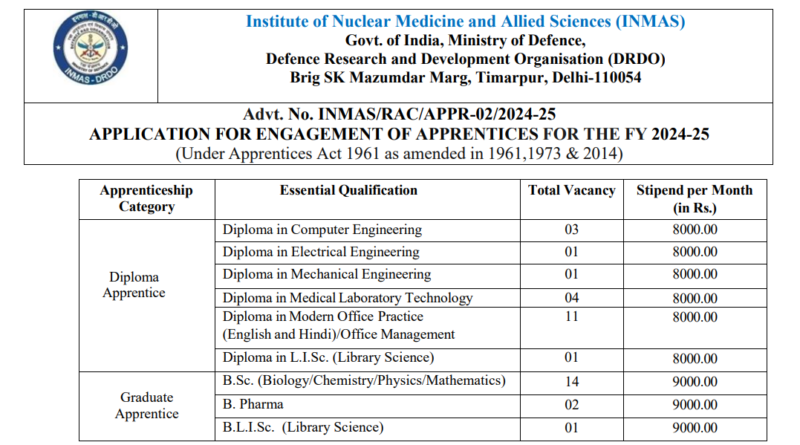 DRDO INMAS Recruitment 2024: Institute of Nuclear Medicine and Allied Sciences (INMAS), Delhi, under the aegis of Defence Research & Development Organisation (DRDO), Ministry of Defence is in process of recruitment of apprentices for one year training for the Financial Year-2024-2025. Applications are invited from the eligible candidates in following disciplines. DRDO INMAS Apprentice for Diploma, B.Sc, B.Pharma, B.L.I.Sc candidates.