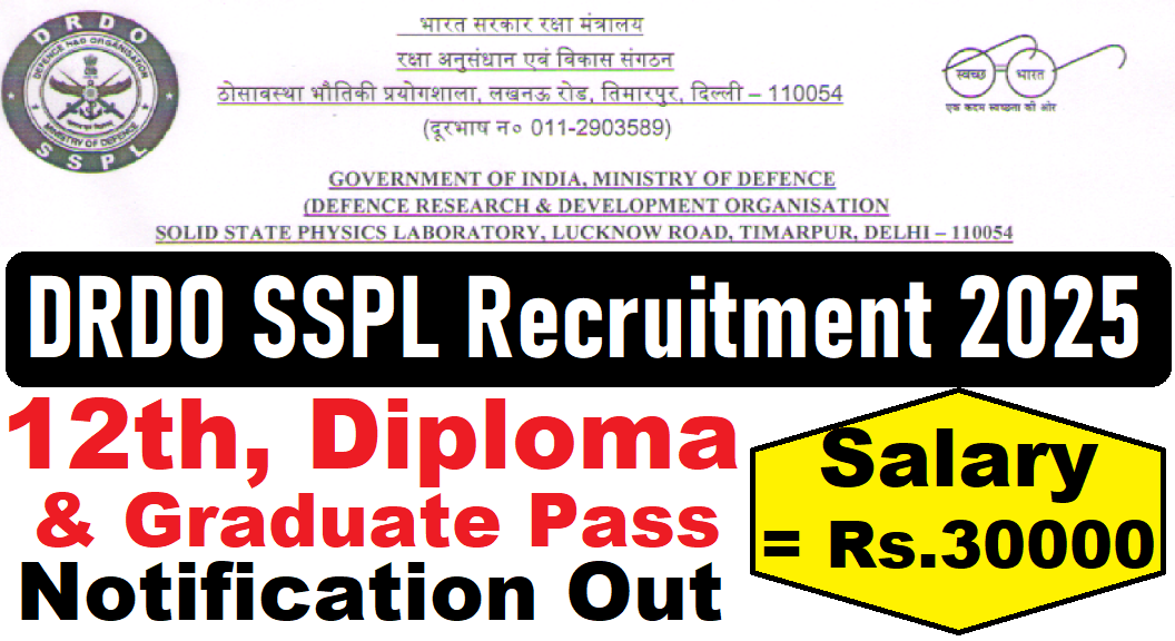 DRDO SSPL Recruitment 2025 : Defence Research and Development Organisation – State Physics Laboratory (SSPL) , Delhi की ओर से 14 Posts पर Walk-In-Interview निकली है जिसका Interview Date 26 September 2025 , सुबह 09:30 बजे है|12th/Diploma & Graduate Pass in various candidates Offline Walk-In-Interview में शामिल हो सकते हैI आपकी Walk-In-Interview Location – Defence Research and Development Organisation Solid State Physics Laboratory Road, Timarpur, delhi – 110054 रहने वाला हैI DRDO SSPL Walk-In-Interviewt 2025 Full Notification निचे दिया गया है |