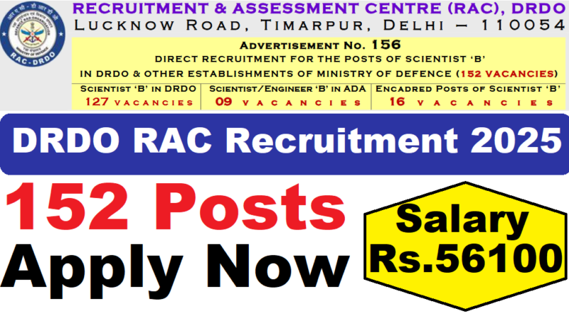 DRDO RAC Recruitment 2025, 152 Posts, Scientist B Latest Vacancy 2025, 04/07/2025 Last Date