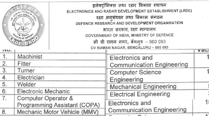 DRDO Apprentice Recruitment 2024: Defence Research and Development Organization Electronic and Radar Development Establishment is one of the premier R& D Establishments set up under the defence R&D Organization, Ministry of Defence, Govt. of India. LDRE invites online applications from eligible candidates for One Year Apprenticeship Training as per the following details under the provisions of the Apprentices Act, 1961, as amended from time to time. DRDO LRDE Apprentice online form apply before 17th March 2024. ITI Pass Machinist, Fitter, Turner, Electrician,Welder, Electronic Mechanic, COPA, MMV trades are eligible to apply. Diploma Pass Electronics and Communication Engineering, Computer Science, Mechanical, Electrical, Civil branch are eligible to apply online. Graduate Pass Electronics and Communication Engineering, Computer Science, Mechanical, Electrical branch are eligible to apply online.