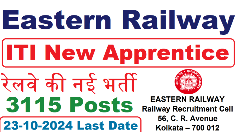 Eastern Railway Apprentice 2024-25 Eastern Railway Kolkata की ओर से ITI Pass candidates के 3115 Posts पर Apprentice निकली l Eastern Railway Apprentice 2024 online form 24/09/2024 से भरना शुरू होगा l Eastern Railway Kolkata Apprentice 2024 online form 23/10/2024 तक भरा जाएगा l ITI Pass Relevant Trade के candidates Eastern Railway Apprentice 2024 form भर सकते हैं l Eastern Railway Kolkata Apprentice All India के candidates भर सकते हैं जिसका Selection Merit list के आधार पर होगा l