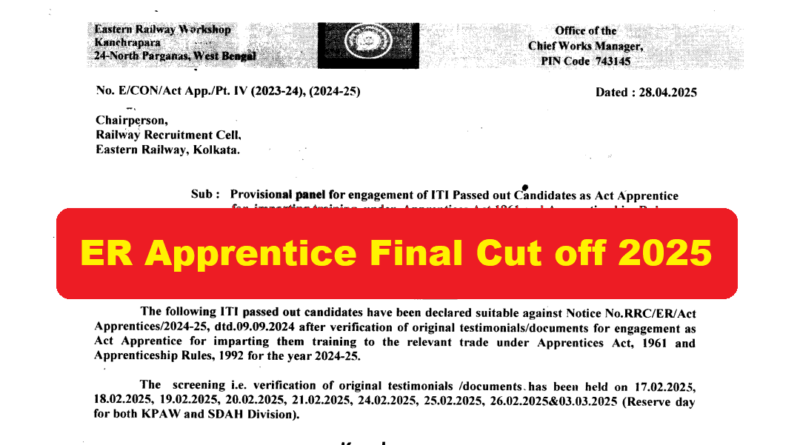 Eastern Railway Apprentice 2025 Final Merit list Out: Eastern Railway Kolkata की ओर से ITI Pass candidates के 3115 Posts पर Apprentice निकली थी l Eastern Railway Apprentice 2024 online form 24/09/2024 से भरना शुरू हुआ था l Eastern Railway Kolkata Apprentice 2024 online form 23/10/2024 तक भरा गया l Eastern Railway Apprentice 2025 के सभी Division का Document Verification हो चुके हैं | Eastern Railway Apprentice 2025 के Howrah, Liluah, Sealdah, Kanchrapara, Malda,Asansol, Jamalpur Division का official cut off release हो चूका है | RRC ER Apprentice cut off 2025 निचे दी गई है | आज Eastern Railway Apprentice Document Verification के बाद सही पाए जाने के बाद Final Merit list Training के लिए जारी कर दिया गया है | कुछ दिन के बाद Joining के लिए Call letter अपने Mail पर या by post भेजा जायेगा |