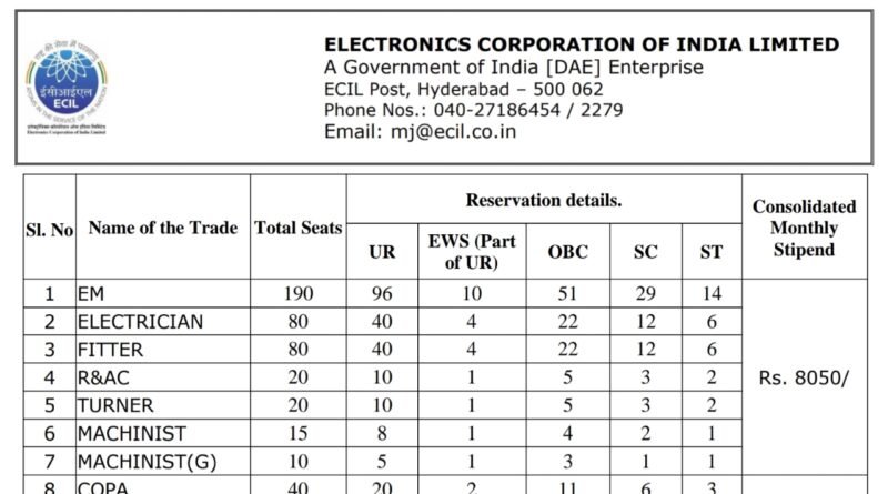 ECIL Apprentice Recruitment 2023, ITI Electrician, Fitter, EM, RAC,COPA etc Apprentice 2023