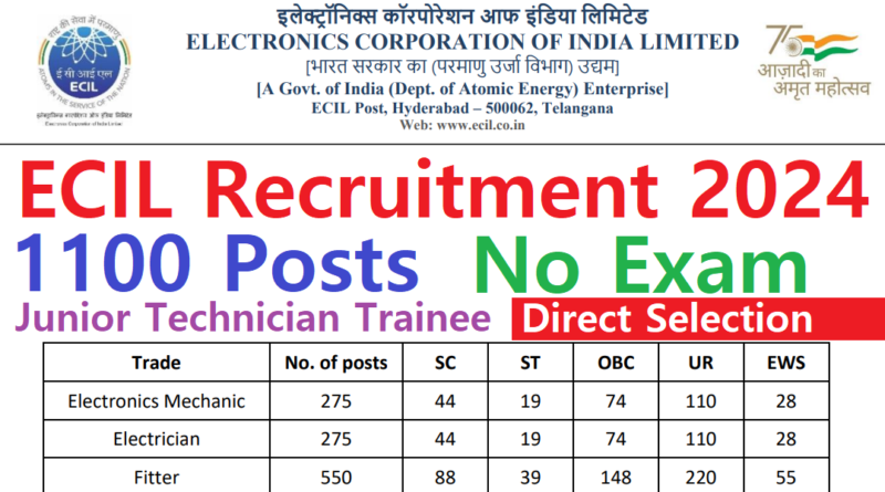 ECIL Junior Technician Recruitment 2024, ITI Electrician, Fitter, Electronic Mechanic latest Vacancy 2024
