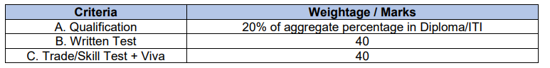 - Subsequently, shortlisted candidates will be evaluated based on marks of the written Test & Skill/Trade Test with Viva and final recommendations shall be made as per the merit (A+B+C) through following criteria: