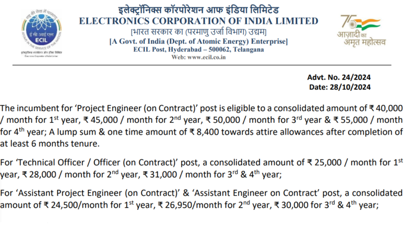 ECIL Various Posts Recruitent 2024 Offline form: Electronics Corporation of India Limited is looking for dynamic, experienced and result oriented personnel purely on fixed tenure basis, for a period of One Year (extendable up to four years including the initial term, depending on project requirements & satisfactory performance of the candidate) to work for various Business Verticals across the country. ECIL Recruitment 2024 for Project Engineer, Technical Officer, Assistant Project Engineer(AFP)/Assistant Engineer on contract basis. ECIL Recruitment 2024 walk in dates 04-11-2024 to 11-11-2024. ECIL Recruitment for Diploma, BE,BTech, MSc candidates are eligible.