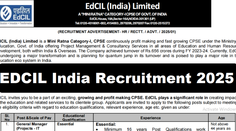 EDCIL India Recruitment 2025, GM Posts Latest Vacancy 2025, 31/01/2025 Last Date