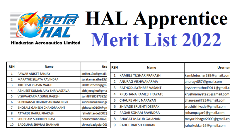 HAL Apprentice Merit list 2022,Final Merit list 2022