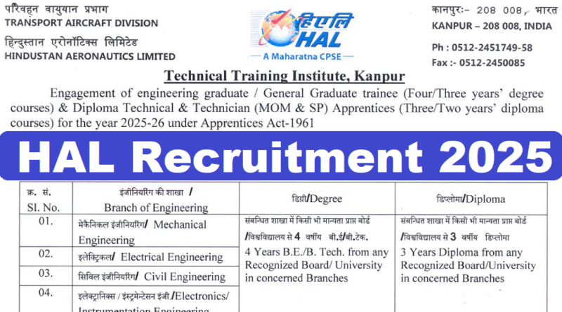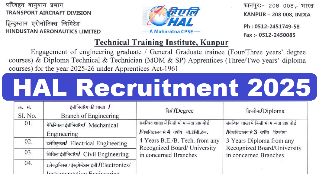 HAL Recruitment 2025 : Hindustan Aeronautics Limited (HAL) की ओर से Apprentice Posts पर Recruitment निकली है जिसका Speed Post Application form 15/07/2025 से शुरू है | HAL Recruitment 2025 Speed Post Application form 04/08/2025 तक भरा जायेगा |Diploma & Graduate Pass in various candidates HAL Recruitment 2025 Speed Post Application form भर सकता है | Interested and eligible candidates HAL Recruitment 2025 form भर सकते हैं | HAL Recruitment Full Notification निचे दिया गया हैI HAL Recruitment Send to Application Address निचे दिया गया है I