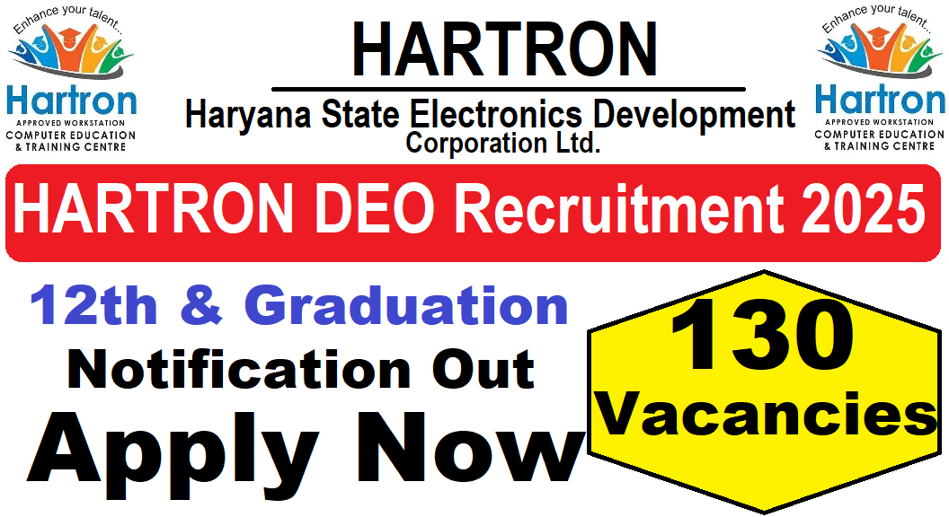 HARTRON DEO Recruitment 2025 : Haryana State Electronics Development Corporation Ltd. (HARTRON) की ओर से 130 Posts पर Recruitment निकली है जिसका Online form 05/08/2025 से शुरू है |HARTRON DEO Recruitment 2025 Online form 19/08/2025 तक भरा जायेगा |12th & Graduation Pass in various candidates HARTRON DEO Recruitment 2025 online form भर सकता है | Interested and eligible candidates HARTRON DEO Recruitment 2025 form भर सकते हैं |HARTRON DEO Recruitment Full Notification निचे दिया गया हैI HARTRON DEO Recruitment Apply Link निचे दिया गया है I