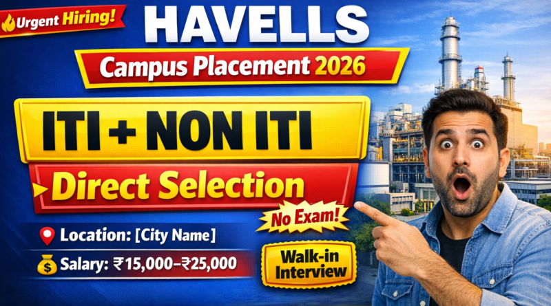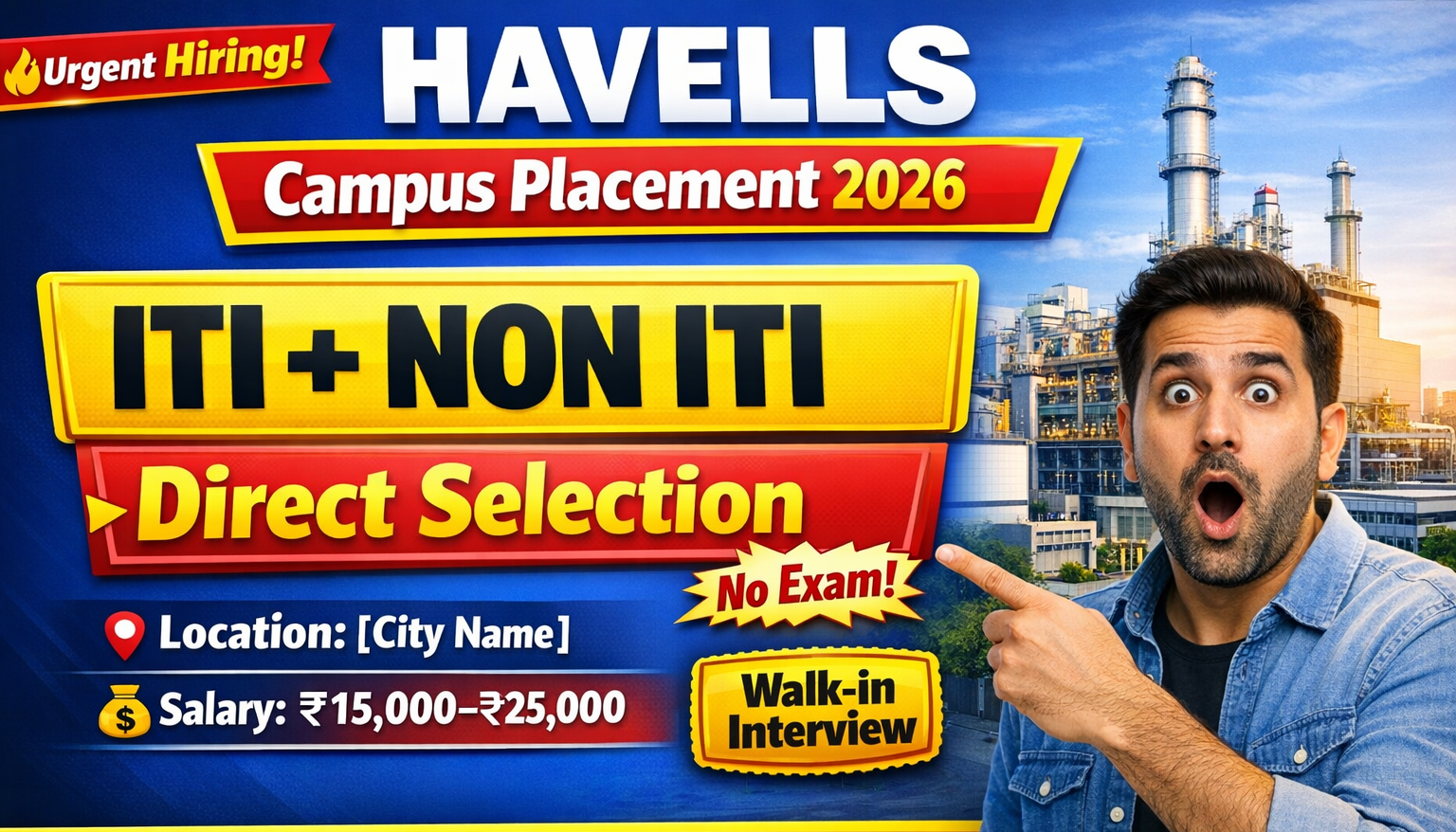 Havells Campus Placement Drive 2026: Havells Rajasthan Company की ओर से ITI Pass candidates के लिए Helper और Supervisor Posts पर Campus Placement होने वाला है | Havells Campus Placement की जानकारी निचे दी गयी है |