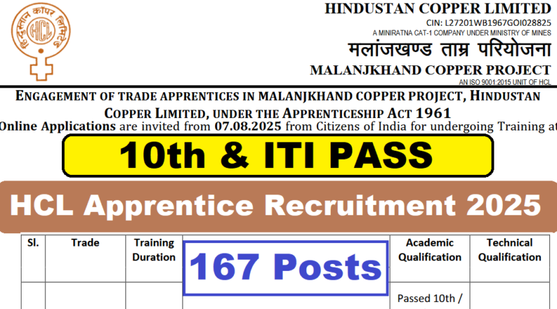 HCL Apprentice Recruitment 2025 : Hindustan Copper Limited (HCL) की ओर से 167 Posts पर Recruitment निकली है जिसका Online form 07/08/2025 से शुरू है |HCL Recruitment 2025 Online form 27/08/2025 तक भरा जायेगा | 10th & ITI Pass in various candidates HCL Recruitment 2025 online form भर सकता है | Interested and eligible candidates HCL Recruitment 2025 form भर सकते हैं |HCL Recruitment Full Notification निचे दिया गया हैI HCL Recruitment Apply Link निचे दिया गया है I