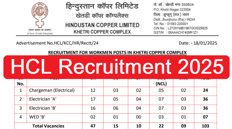 HCL Recruitment 2025 : Hindustan Copper Limited (HCL) की ओर से 103 Posts पर Recruitment निकली है जिसका Online form 27/01/2025 से शुरू है | Recruitment 2025 Online form 25/02/2025 तक भरा जायेगा | ITI, Diploma & Technician pass in various candidates HCL Recruitment online form भर सकता है | HCL Interested and eligible candidates HCL Recruitment form भर सकते हैं |HCL Recruitment Full Notification निचे दिया गया हैI HCL Recruitment Apply Link निचे दिया गया है I