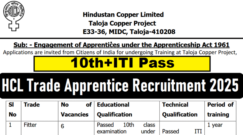 HCL Trade Apprentice Recruitment 2025 : Hindustan Copper Limited (HCL) की ओर से 10 Posts पर Recruitment निकली है जिसका Speed Post form 06/09/2025 से शुरू है | HCL Trade Recruitment 2025 Speed Post form 30/09/2025 तक भरा जायेगा | 10+2 with ITI Pass in various candidates HCL Trade Recruitment 2025 Speed Post form भर सकता है | Interested and eligible candidates HCL Trade Recruitment 2025 form भर सकते हैं | HCL Trade Recruitment Full Notification निचे दिया गया हैI HCL Trade Recruitment Apply Link निचे दिया गया है I