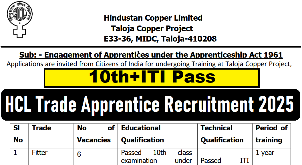 HCL Trade Apprentice Recruitment 2025 : Hindustan Copper Limited (HCL) की ओर से 10 Posts पर Recruitment निकली है जिसका Speed Post form 06/09/2025 से शुरू है | HCL Trade Recruitment 2025 Speed Post form 30/09/2025 तक भरा जायेगा | 10+2 with ITI Pass in various candidates HCL Trade Recruitment 2025 Speed Post form भर सकता है | Interested and eligible candidates HCL Trade Recruitment 2025 form भर सकते हैं | HCL Trade Recruitment Full Notification निचे दिया गया हैI HCL Trade Recruitment Apply Link निचे दिया गया है I