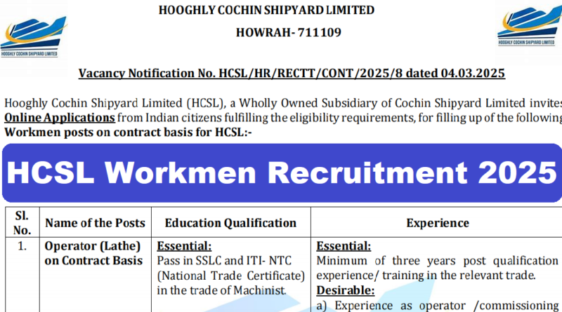 HCSL Workmen Recruitment 2025 : The Hooghly Cochin Shipyard Limited (HCSL) की ओर से 05 Posts पर Recruitment निकली है जिसका Online form 04/03/2025 से शुरू है | HCSL Workmen Recruitment 2025 Online form 24/03/2025 तक भरा जायेगा | 10th + Pass in various candidates HCSL Workmen Recruitment 2025 online form भर सकता है | Interested and eligible candidates HCSL Workmen Recruitment form भर सकते हैं |HCSL Workmen Recruitment Full Notification निचे दिया गया हैI HCSL Workmen Recruitment 2025 Apply Link निचे दिया गया है I