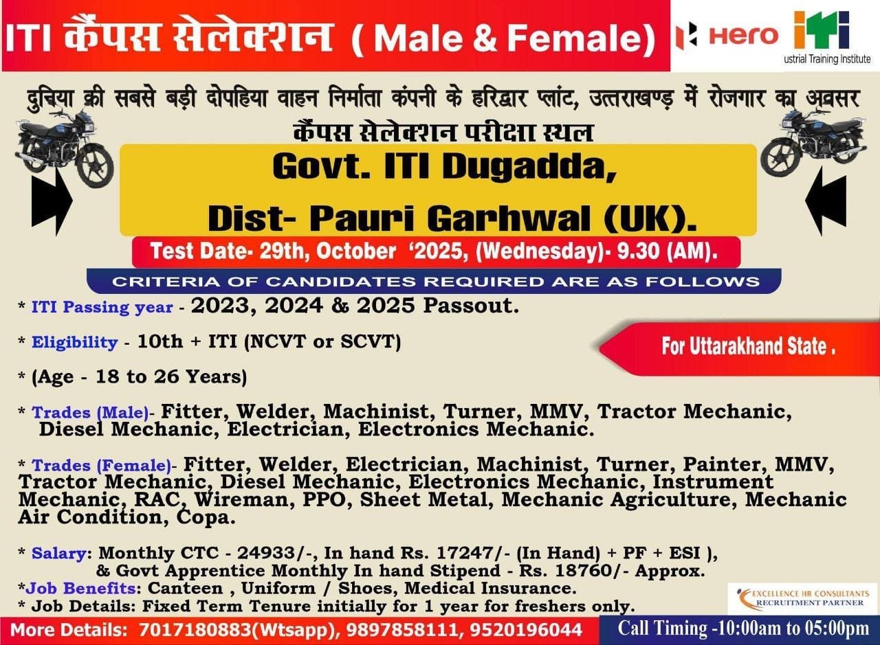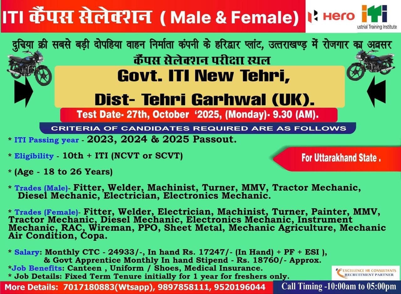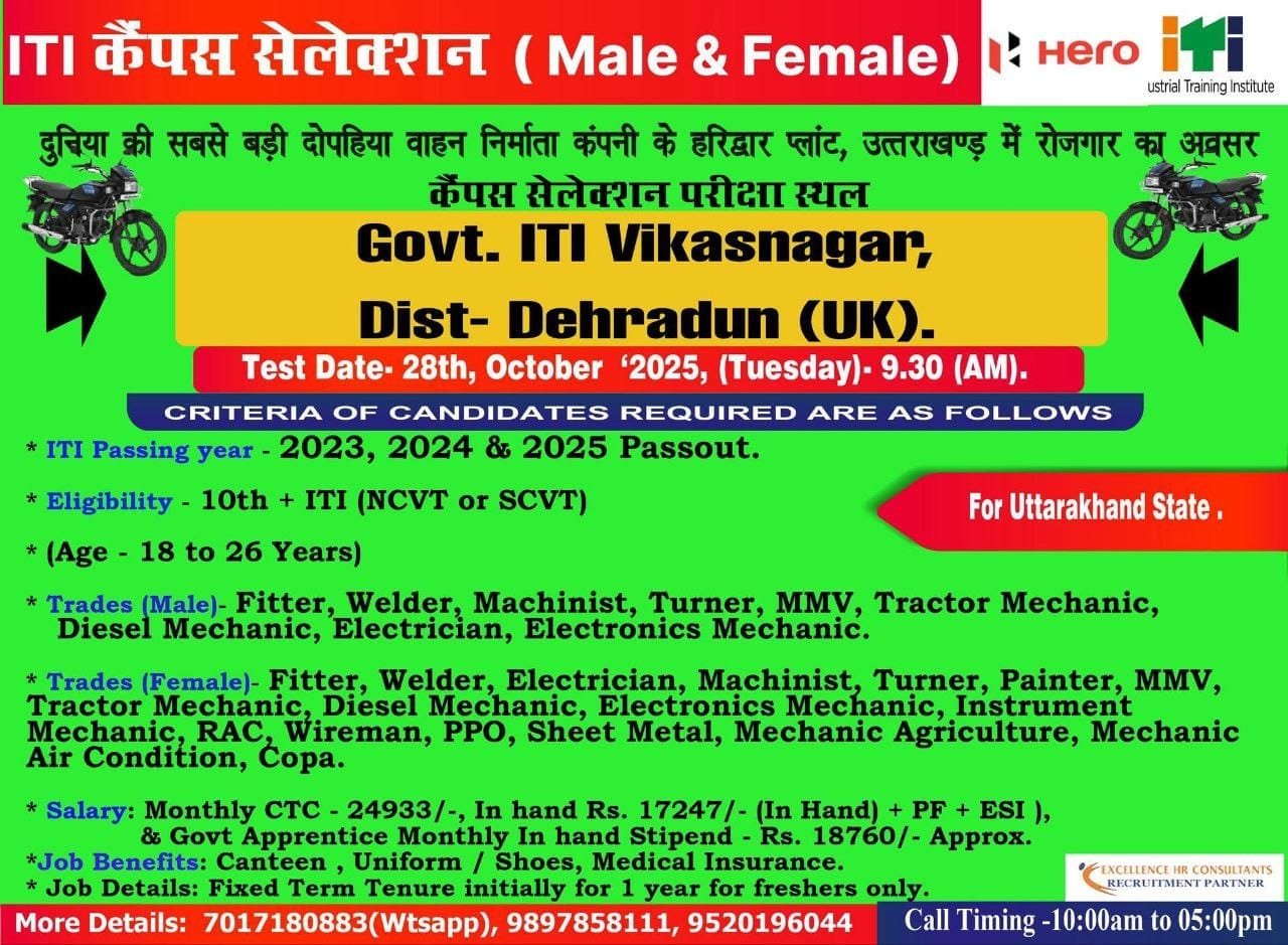 Hero Uttarakhand Campus Placement 2025, ITI Pass Latest Vacancy 2025