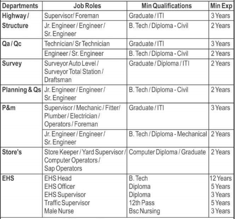 HG Infra Engineering LTD को निचे दिए गये vacancy पर Road Construction Projects जे लिए candidates की आवश्यकता है |