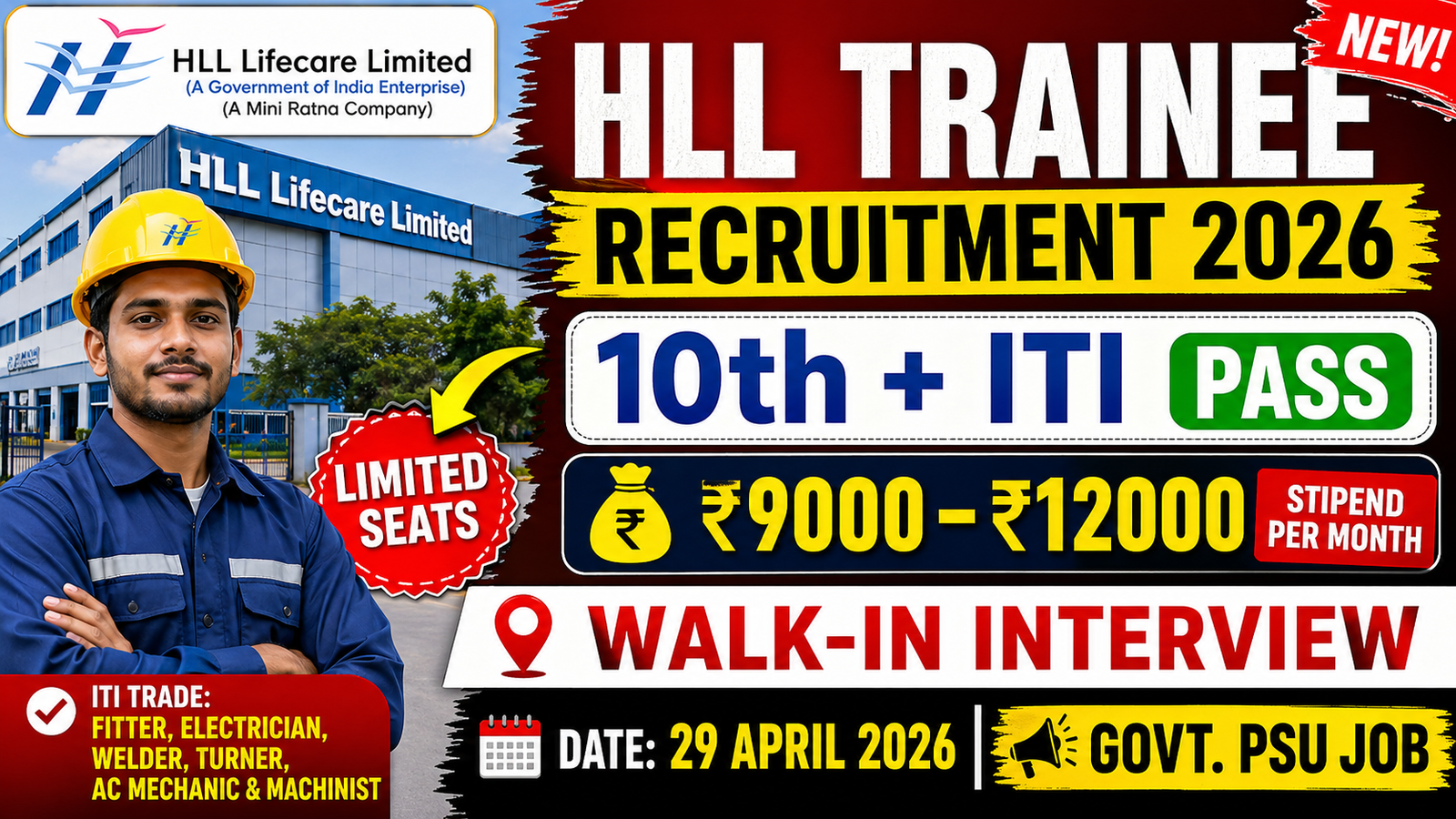 HLL Trainee Recruitment 2026 : HLL Lifecare Limited (Govt. of India — Ministry of Health & Family Welfare, Mini Ratna PSU) ने अपनी Kanagala Factory, Belagavi, Karnataka में Training & Development Scheme (TDS) के तहत ITI और SSLC Trainees की भर्ती के लिए Walk-in Interview 29 April 2026 को आमंत्रित किया है। Training Period 3 Years होगी और Stipend ₹9,000 से ₹12,000 तक मिलेगा।