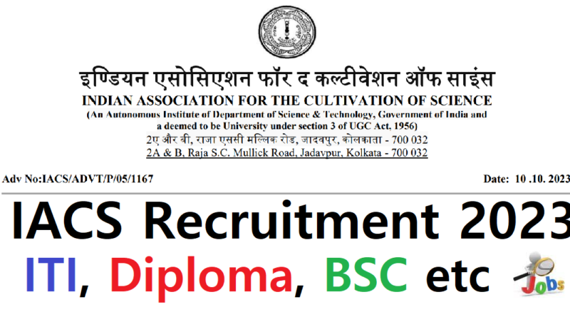 ICAS MTS Technical Recruitment 2023: Applications are invited from eligible candidates using the form available in the website of the Indian Association for the Cultivation of Science (www.iacs.res.in) for filling up the following regular posts on direct recruitment on the result of open competitive selection procedure as detailed below. The form will also be available in the Receipt & Dispatch Section of IACS on any working day during 11 a.m. – 4 p.m. till the closing date of receiving the application. IACS Recruitment 2023 online form Apply from 10 October 2023 to 24 November 2023. Before apply check full notification of IACS Recruitment 2023.