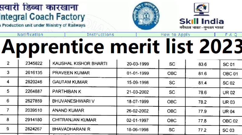 ICF Chennai Apprentice Merit list 2023